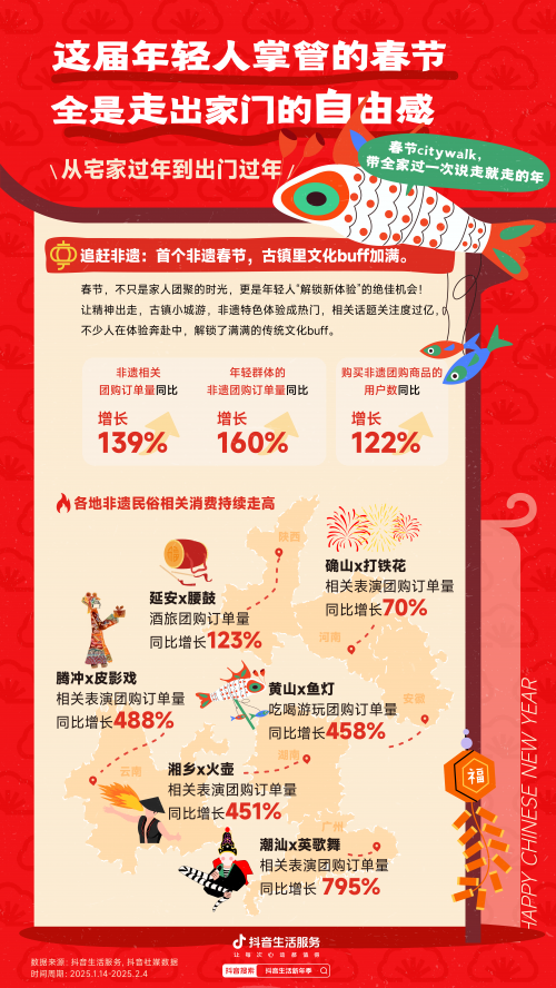 蛇年春节,各地非遗民俗相关消费持续走高。根据抖音生活服务的数据,以鱼灯出圈的黄山,春节吃喝游玩订单量同比上涨458%;以皮影戏闻名的腾冲和以英歌舞闻名的潮汕,春节相关表演团购的订单量分别同比上涨488%和795%。