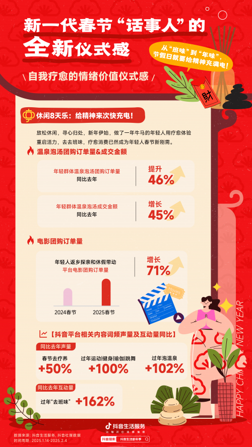 看电影、泡温泉、做瑜伽、做疗养......这些情绪疗愈活动正在成为年轻人的春节快乐必备项目。随着年轻人返乡探亲和休假,也推动了各地情绪消费的热潮。平台数据显示,今年春节,年轻人温泉泡汤的团购订单量和成交金额同比增长了46%和45%,平台电影团购订单量也同比增长了71%。