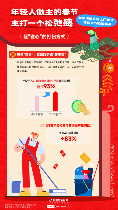 2025年春节期间,年轻人上门保洁服务的团购订单量同比去年增长了93%,年前上门清洁服务的相关内容声量也同比增长了83%。