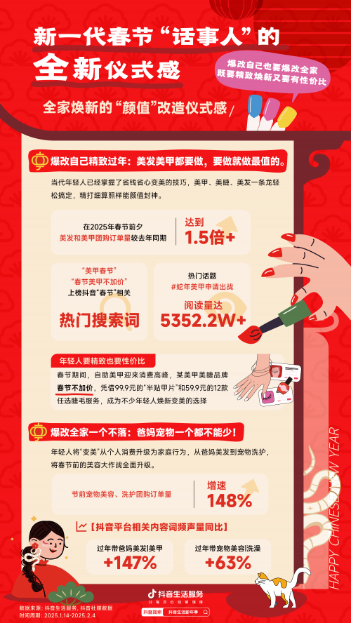 抖音生活服务数据显示,2025年春节前夕,美发和美甲团购订单量均达到去年的1.5倍以上。与此同时,年轻人看重服务产品的质价比,2025年“美甲春节”、“春节美甲不加价”上榜抖音“春节”相关热门搜索词。