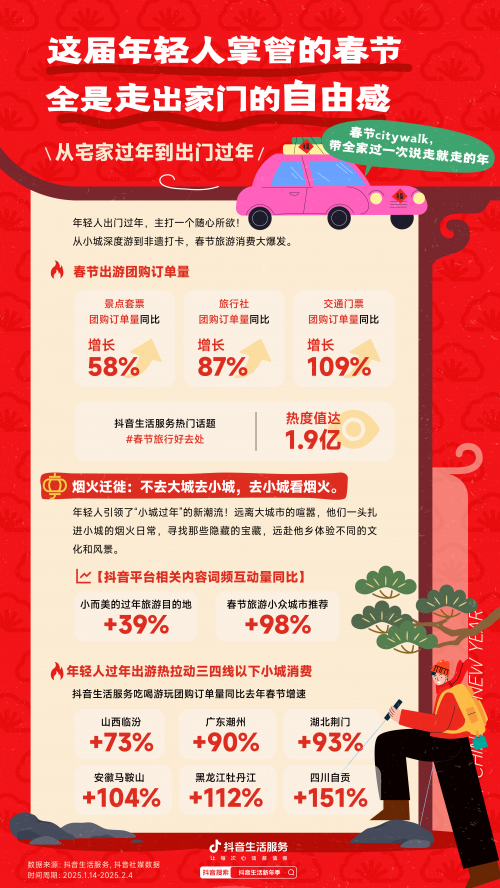 根据抖音生活服务数据,春节出游团购订单量大幅提升,其中景点套票团购订单量、探店达人带动旅行社团购订单量、交通门票团购订单量分别同比增长58%、87%、109%。
