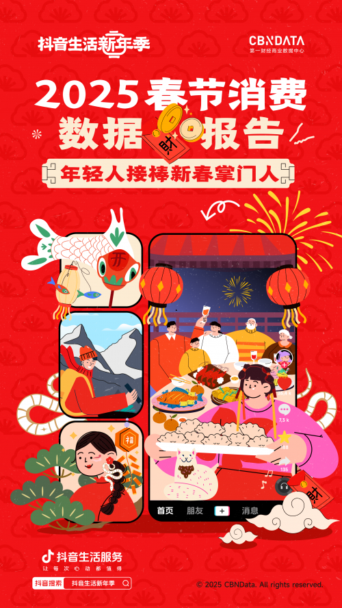 在此背景下,抖音生活服务联合第一财经商业数据中心(CBNData)发布《2025春节消费数据报告——年轻人接棒新春掌门人》,通过数据还原春节期间人们在吃喝玩乐和各项筹备事宜上的消费图景。我们发现,2025年春节期间,18-30岁的年轻人已经是抖音生活服务平台吃喝玩乐的消费主力军,而在年轻一代的积极参与下,蛇年春节正呈现出独特的仪式感、自由感和松弛感,年味也因此变得更多元。