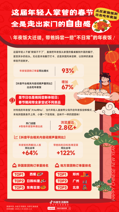 从抖音生活服务数据来看,今年春节,年夜饭团购订单量同比增长了93%,关于“出去吃年夜饭”的内容声量也增加了67%,人们越来越愿意在外享受一顿年夜饭。即便不亲自下厨,也能吃到地道的家乡菜。平台数据显示,东北菜、闽菜、江浙菜、徽菜等地方菜的团购订单量同比增长143%、115%、112%和263%。