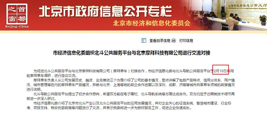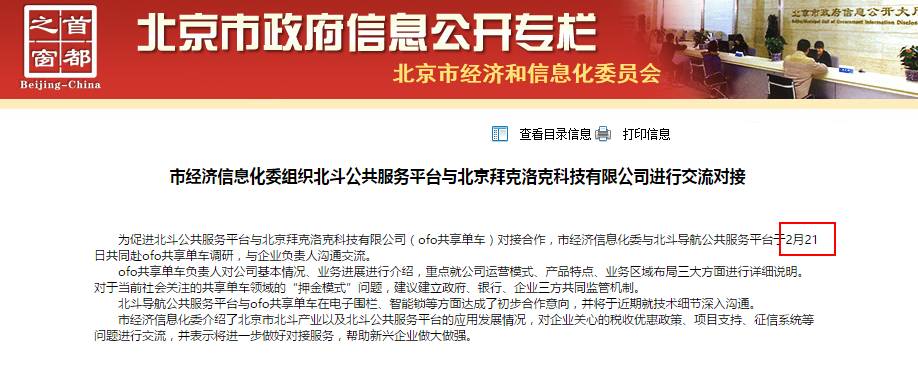 速途网通过查看首都之窗(http://www.beijing.gov.cn/)发现,北斗导航与摩拜、ofo均进行过调研洽谈,而从时间上来看,摩拜单车早于ofo,但摩拜单车是否与北斗导航进行了合作,目前尚未有任何消息披露。但我们从ofo的这场会集京津冀领导的发布会或许可以感受到一个信号,京津冀未来共享单车标准或是必须配备北斗导航智能锁。