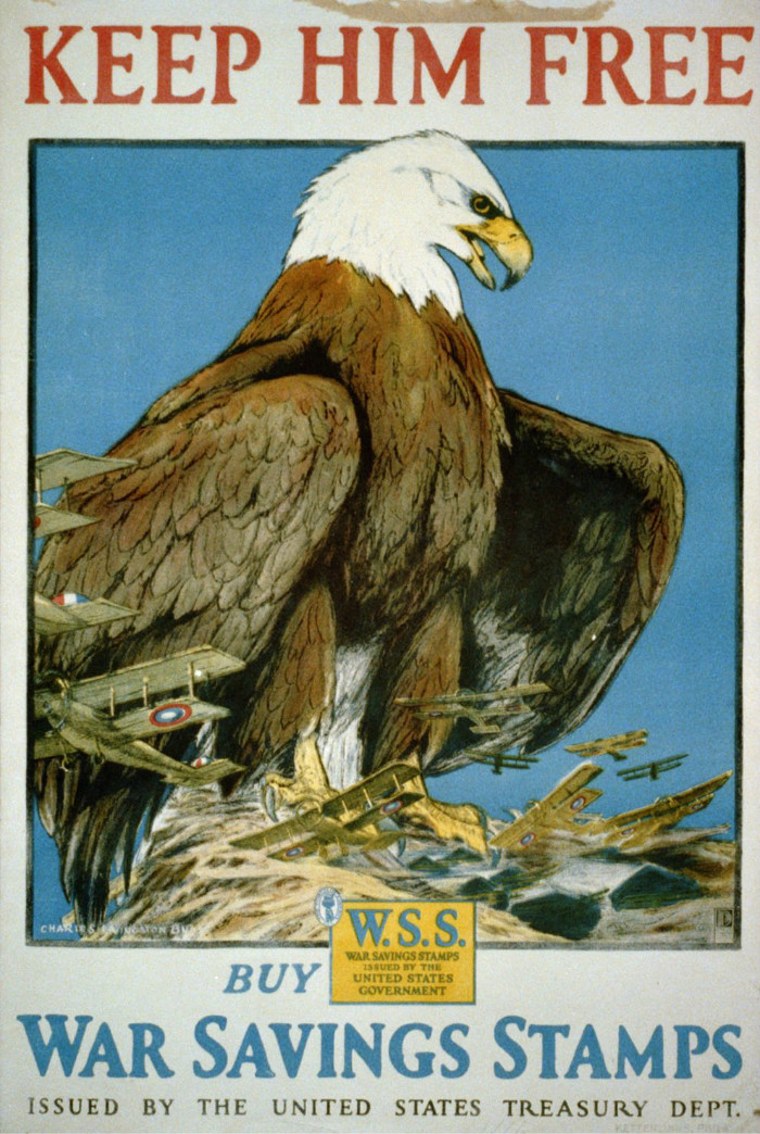 让他自由——请购买战争储蓄券。本张海报由美国财政部发布,设计者为Charles Livingstone Bull。