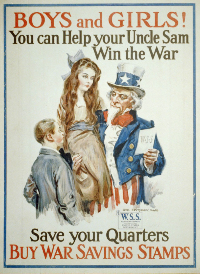 孩子们!帮助山姆叔叔打赢战争吧!请省些零花钱购买战争储备券。设计者为James Montgomery Flagg。