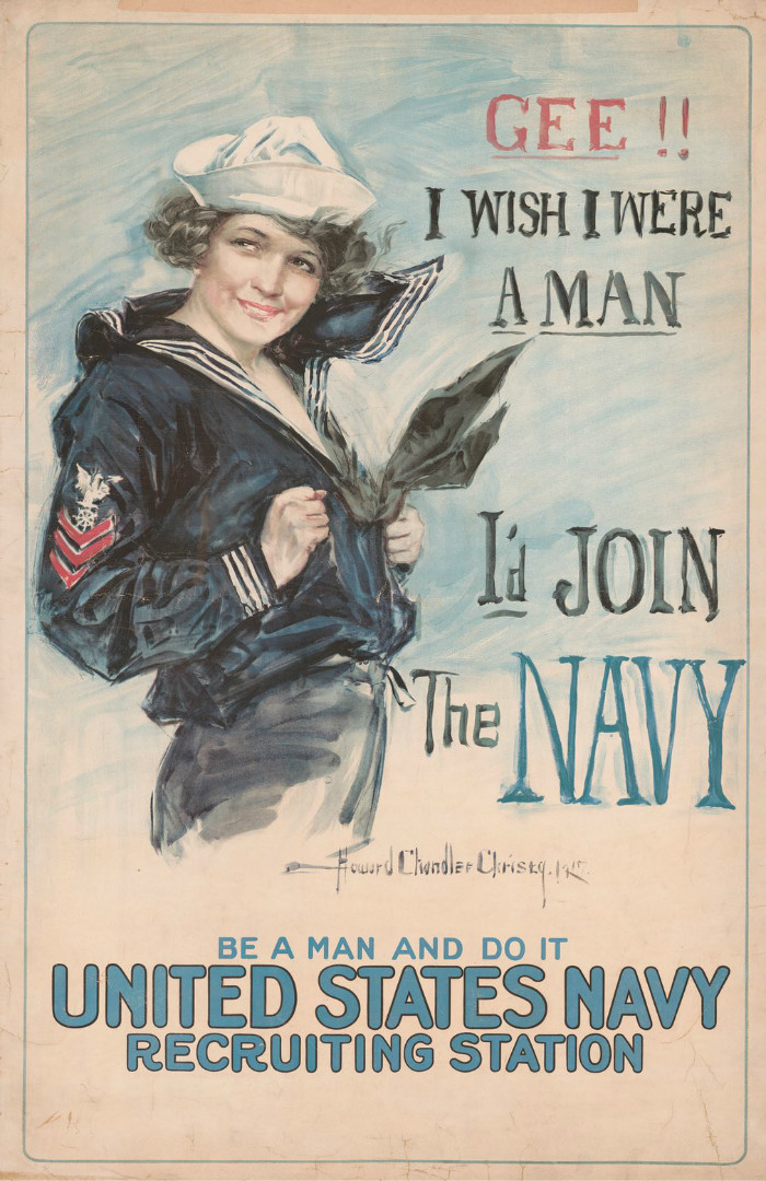 天啊!真希望我是男人,成为海军光荣一员——像男人一样去战斗!Howard Chandler Christy设计的海军征兵海报。