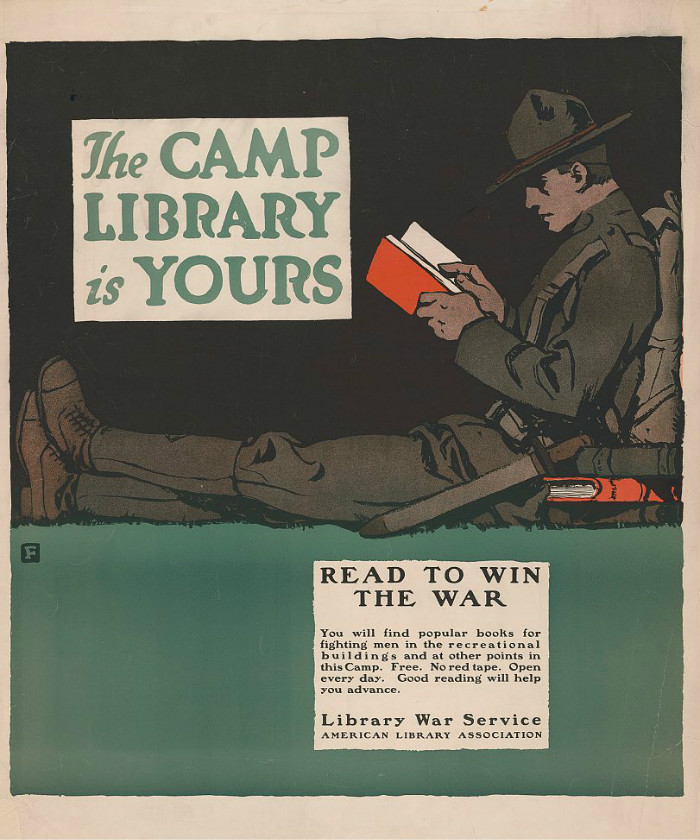军营图书馆属于你——加入阅读,助力战争。设计者为Charles Buckles Falls。