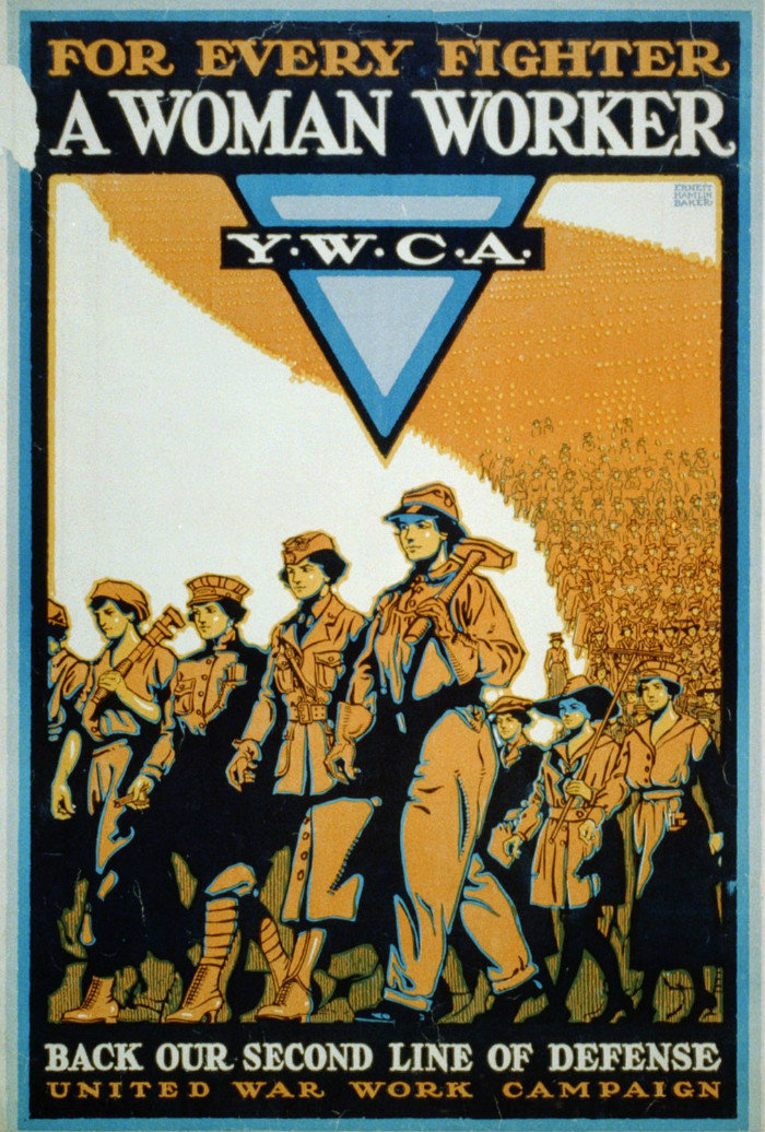 每位远征战士的离开,都需要一位女工勇敢站出来!——基督教女青年会。请您一同保卫第二道防线。设计者为Ernest Hamlin Baker。