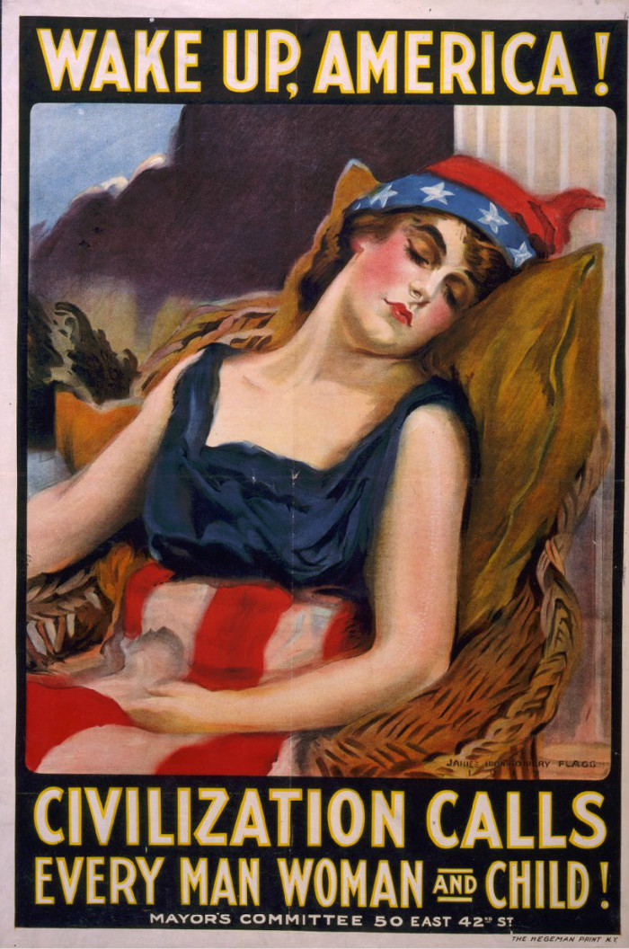 苏醒吧美国!人类文明正在召唤每个男人,每个女人,每个孩子!设计者为James Montgomery Flagg。