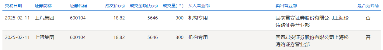 上汽集团今日大宗交易折价成交600万股,成交额1.13亿元