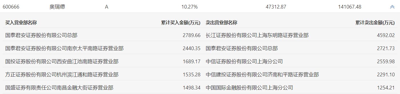 2月11日,奥瑞德今日涨停,龙虎榜数据显示,上榜营业部席位全天成交2.34亿元,占当日总成交金额比例为16.57%。其中,买入金额为9952.8万元,卖出金额为1.34亿元,合计净卖出3466.24万元。
