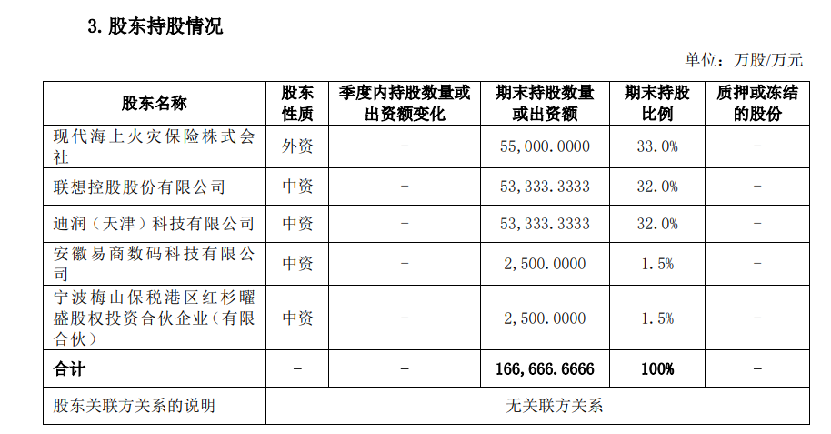 其中,现代海上火灾保险株式会社的持股比例由100%降至33%,但仍为第一大股东;联想控股股份有限公司和迪润(天津)科技有限公司分别持股32%,同为第二大股东;安徽易商数码科技有限公司和宁波梅山保税港区红杉曜盛股权投资合伙企业分别持股1.5%。