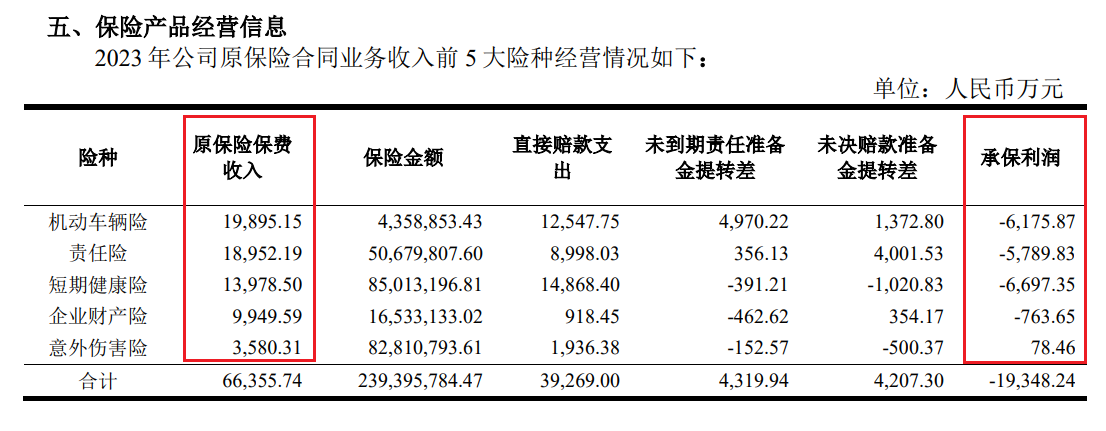 2023年年度报告显示,现代财险原保险合同业务收入前五大险种承保利润合计亏损1.93亿元。