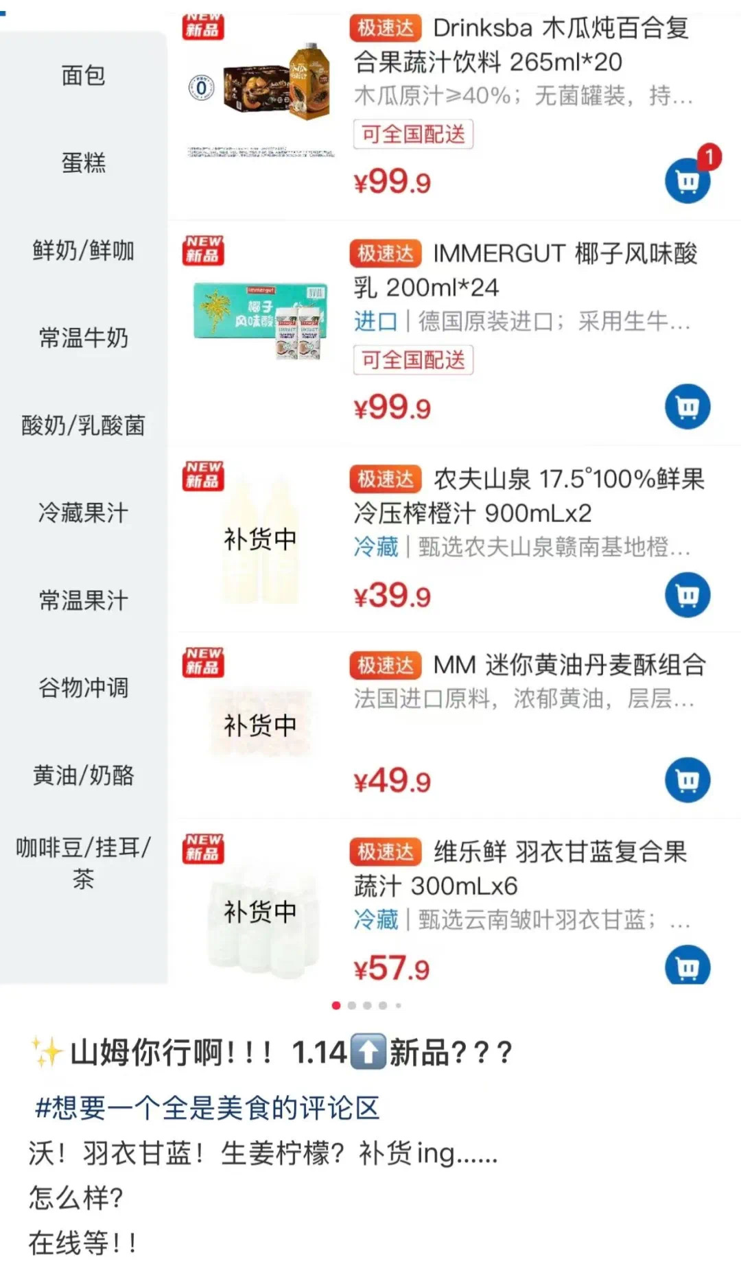 在山姆APP,这款果蔬汁标注有“月销20万+件”,甚至卖到缺货。不少网友发帖“吐槽”,通过山姆极速达购买「羽衣甘蓝复合果蔬汁」,却显示“补货中”。