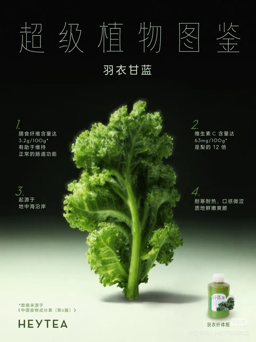 实际上,自2024年年中起,羽衣甘蓝就已经成为新茶饮产品、瓶装饮料甚至冲泡饮品最受欢迎的原料之一。据此前报道,在「羽衣纤体瓶」上新后不久,一个月时间,喜茶就消耗了100000+斤的羽衣甘蓝。[3]
