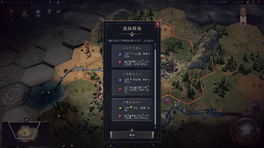 举几个例子,视听方面,各种廉价的细宋体泛滥,与游戏的画风完全不搭。在游戏加载界面,领袖介绍的文字和文明介绍的文字甚至不是一个字体,令人哭笑不得。游戏中各类UI的排版也是毫无美感可言,在选择政体时,本作的选择界面像是大学生应付了事的课程作业。