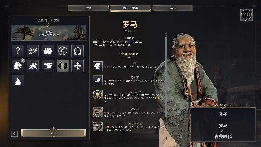 在时代系统的机制下,衍生出了第二个大创新——文明与领袖分离。简单来说,就是让领袖与其对应的文明之间不再绑定,并且每个时代开始时,你都需要选择新的文明。比如你可以扮演孔子来领导高棉;扮演卡特捷琳娜来领导法兰西王国,也可以尊重史实,体验在孔子率领下,从汉朝发展到清朝的历史进程。这个机制可以说是牺牲了沉浸感来增强游戏性,不同文明和领袖之间的“乱炖”确实很滑稽,但会带来玩法上的更多可能性,给玩家带来类似肉鸽的快感。