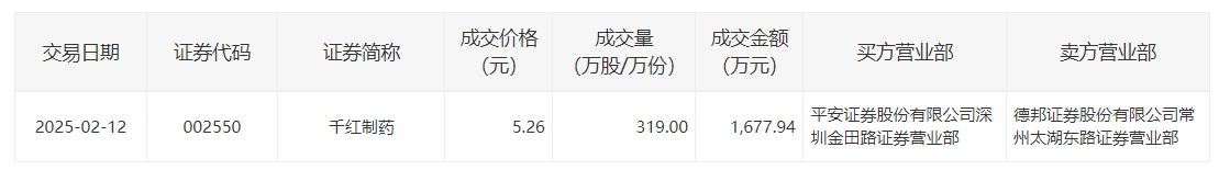 千红制药2月12日大宗交易成交319万股,成交额1677.94万元,占当日总成交额的13.69%,成交价5.26元,较市场收盘价5.62元折价6.41%。