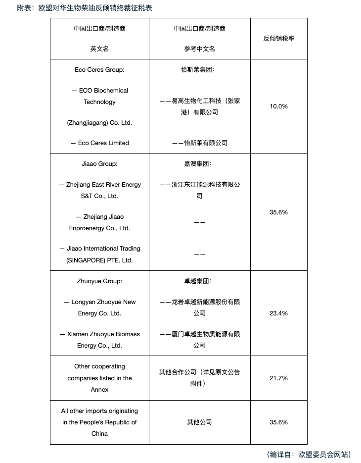 2023年12月20日, 欧盟委员会对原产于中国的生物柴油发起反倾销调查。2024年8月16日,欧盟对该案作出初裁,初步裁定对涉案产品征收12.8%~36.4%的临时反倾销税。