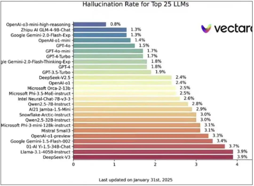 图:市场主流大模型幻觉率(截止2025年1月31日)