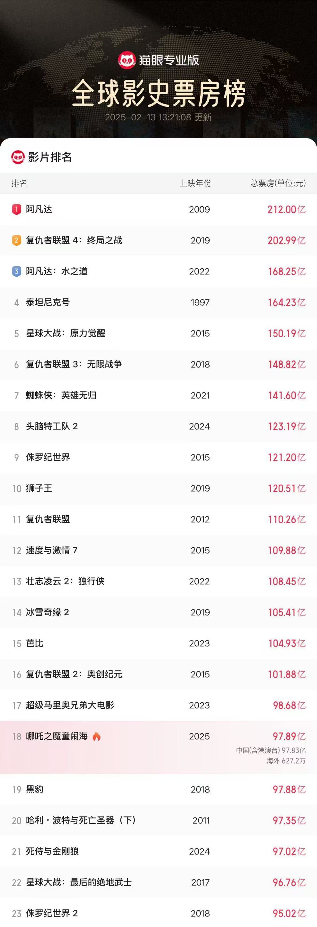 《哪吒之魔童闹海》进入全球影史票房榜前18名