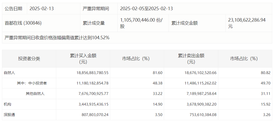 2月13日,深交所披露,首都在线2月5日至13日累计上涨111.77%,涨幅严重异常期间获自然人买入188.57亿元,占比81.6%;其中,中小投资者累计买入111.8亿元,占比48.38%。机构投资者累计买入34.44亿元,占比14.9%。