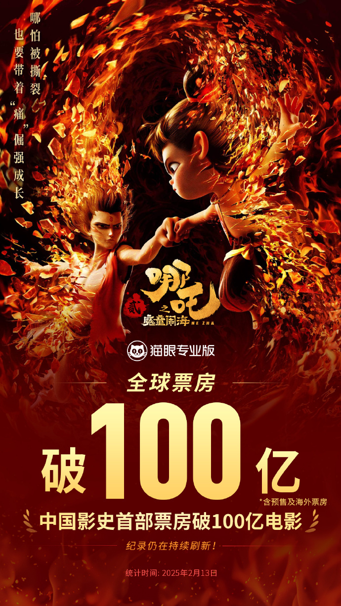 据猫眼专业版数据,电影《哪吒之魔童闹海》全球票房(含预售及海外)突破100亿,成为中国影史首部票房破100亿电影!据猫眼专业版预测票房数据显示,最新预测总票房超160亿,预计将进入全球票房榜前五。