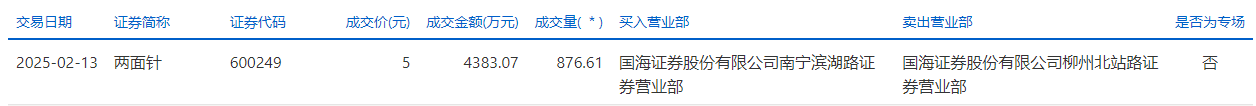 两面针2月13日大宗交易成交876.61万股,成交额4383.07万元,占当日总成交额的47.2%,成交价5元,较市场收盘价5.38元折价7.06%。