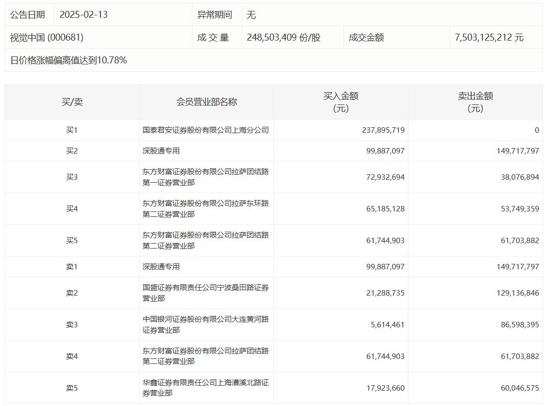 视觉中国今日涨停,龙虎榜数据显示,上榜营业部席位全天成交11.62亿元,占当日总成交金额比例为15.48%。其中,买入金额为5.82亿元,卖出金额为5.79亿元,合计净买入344.26万元。