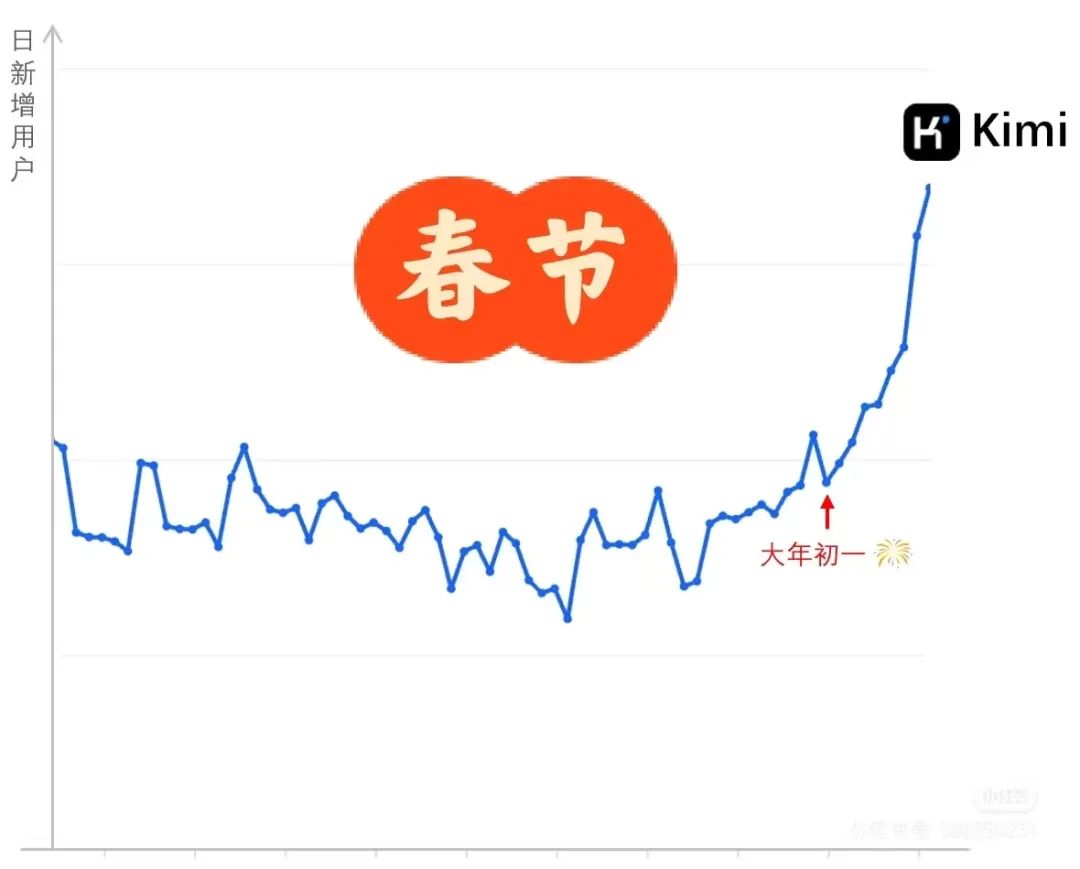 在这场攻守转换中,张予彤先是回顾了这些行业大事,紧接着话锋一转,着重强调Kimi的进步,其表示Kimi新版本上线后,用户量再次创新高。不过其并未公布最新数据,从她公布的曲线图看,从大年初一开始,Kimi的日新增用户数呈直线上升趋势。