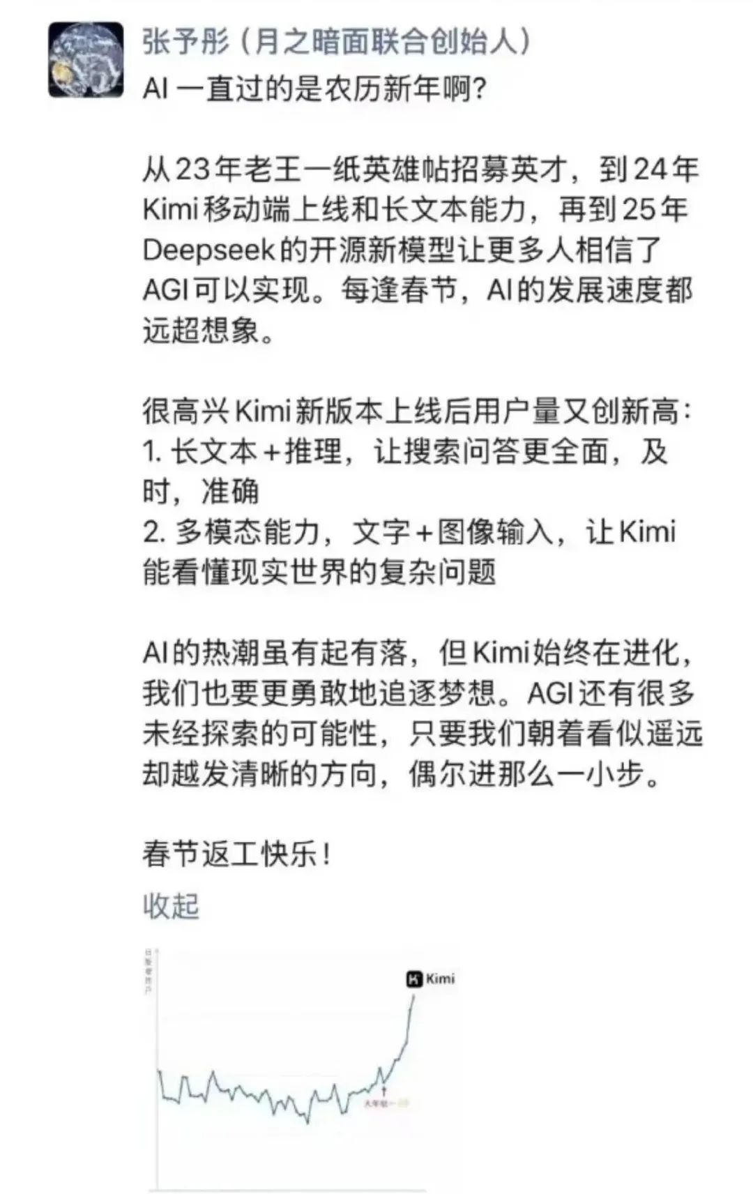 这种静默在2025年2月10日被打破--正值DeepSeek公布AGI突破引发资本狂欢之际,她在社交媒体发声,特意标注Kimi用户创新高的喜讯。