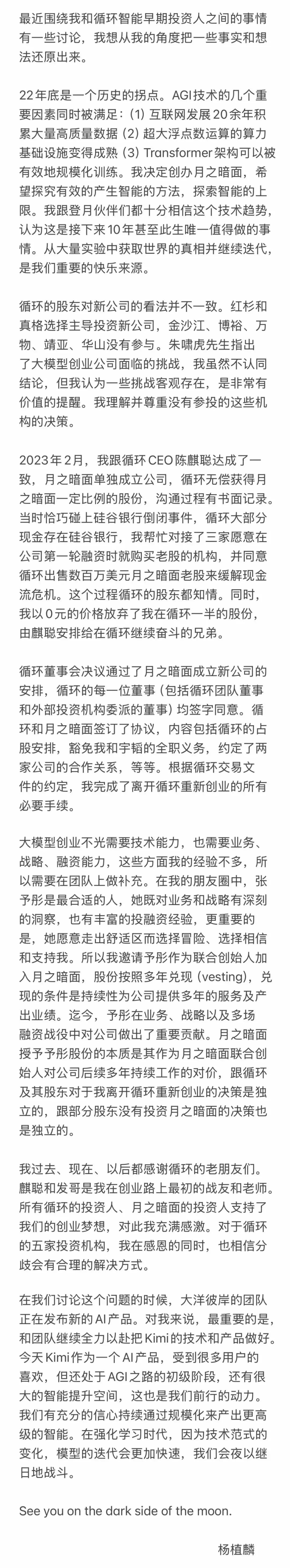 12月6日21点左右,杨植麟回应,称他离开前公司创业时已获得所有董事签字同意和必要手续。同时,张予彤是月之暗面的联合创始人,其股份按照多年贡献逐步兑现(vesting),条件是持续为公司提供服务和业绩支持。