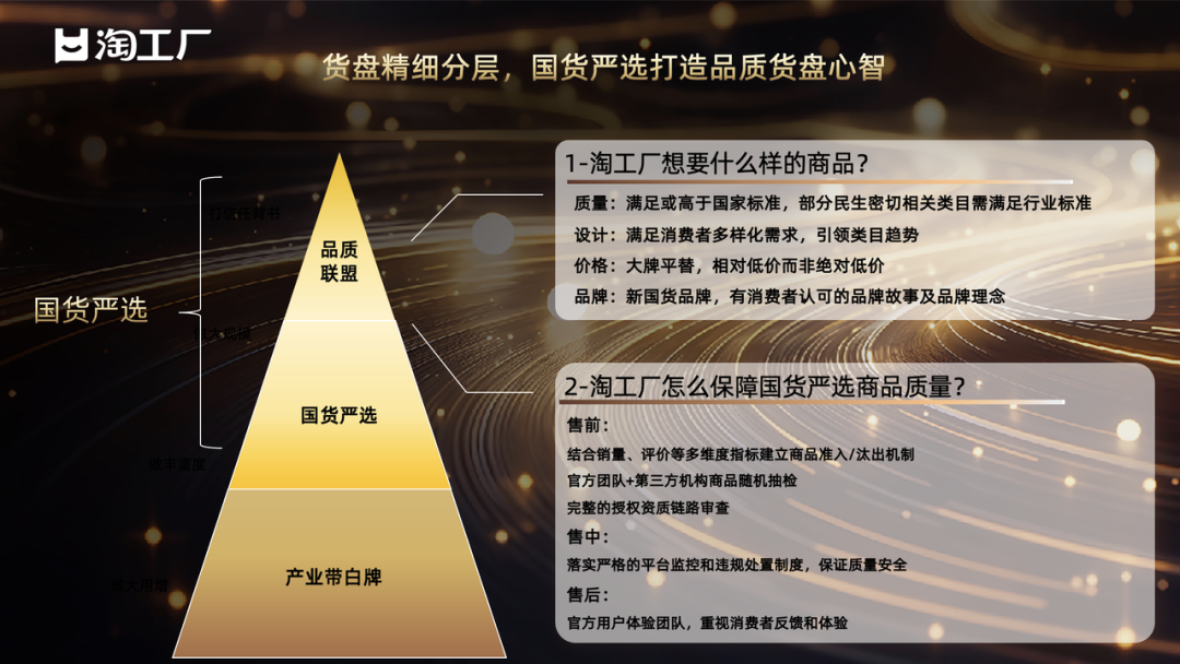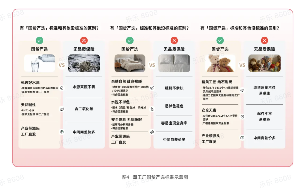 双11期间,淘工厂上线了《淘工厂产业带(国货严选)品质标准》,对炒锅、床品四件套、火锅底料、宠物主粮等25 个涉及到刚需与安全的品类,推出了具体的品质统一规范和标准。