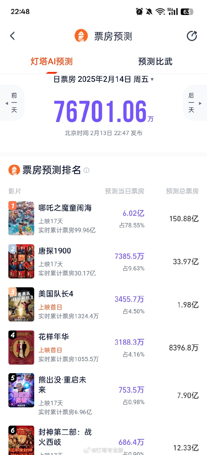 据灯塔AI票房预测显示,《哪吒之魔童闹海》情人节预测票房超6亿,断层领跑,预测总票房150.88亿万。