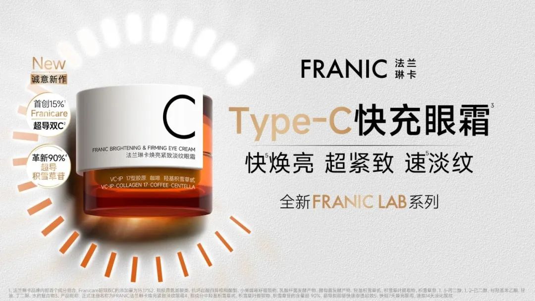 1 月,法兰琳卡FRANIC推出全新FRANIC LAB系列,Type-C快充眼霜作为FRANIC LAB系列首个单品,精准面向追求高效、精准护肤解决方案的年轻女性,致力做“打工人必备眼霜”。