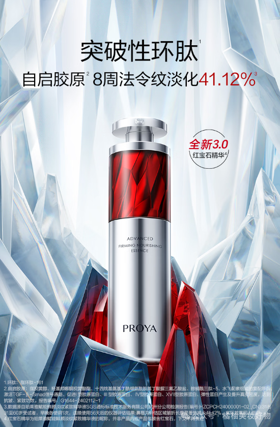 2024年4月,珀莱雅红宝石精华3.0面市,突破性添加了珀莱雅最新里程碑式抗衰科研成果——中国美妆首款独家专利环肽新原料「环肽-161」,占领了抗衰赛道的技术高地。