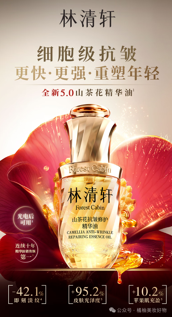 5.0添加全新突破性发酵山茶籽油「清轩萃5.0」,抗氧、抗糖、紧致力更强,主打“细胞级抗皱——有效成分与科技三重激活细胞(激活成纤维细胞、激活细胞活力、增加表皮细胞层厚度)”,产品名变为山茶花“抗皱修护”精华油,概念宣称重心放在“细胞级”与“抗皱+修护”。