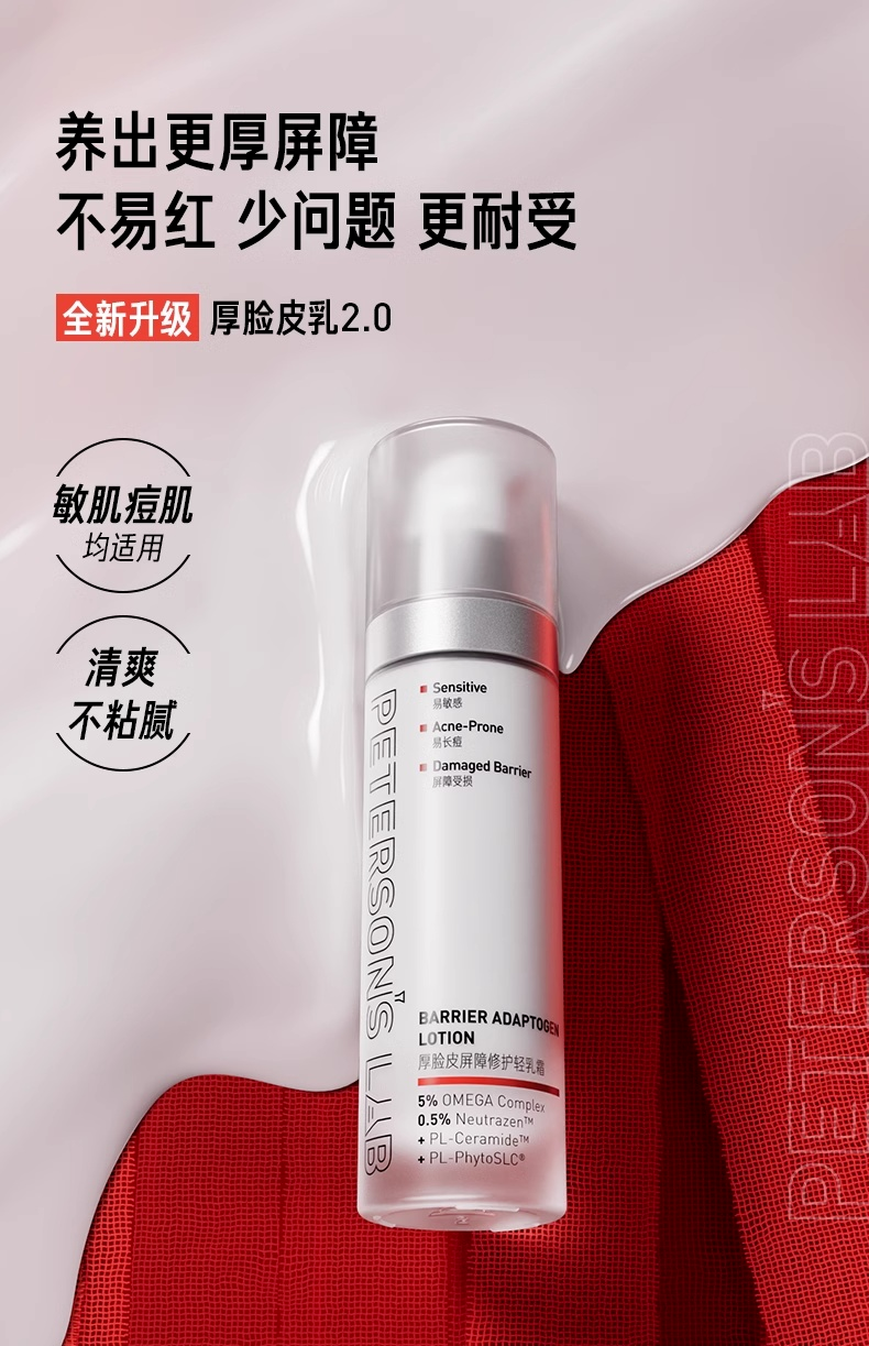 厚脸皮乳作为毕生之研的明星产品之一,在1.0版本已经建立了良好的修复心智和口碑,主要针对肌肤的维稳修复,但只做了敏感肌的功效测试报告。然而,2024年4月上新的2.0版本的升级覆盖了更多人群,为问题皮肤尤其是油痘皮肤,针对性升级了油脂组合,提升了OMEGA-3的含量。