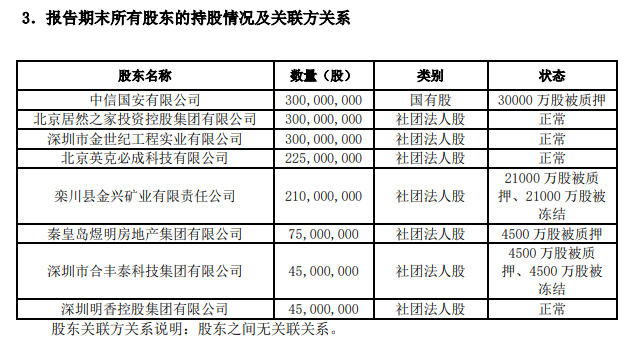 质押股权的股东不仅仅中信国安这一家。截至2024年末,栾川县金兴矿业有限责任公司、秦皇岛煜明房地产集团有限公司等股东均对和泰人寿的股权进行了质押。2024年第四季度偿付能力报告显示,包括中信国安在内,和泰人寿已有4家股东累计约6亿股股份出现被质押或冻结的情况,占和泰人寿总股本的40%。