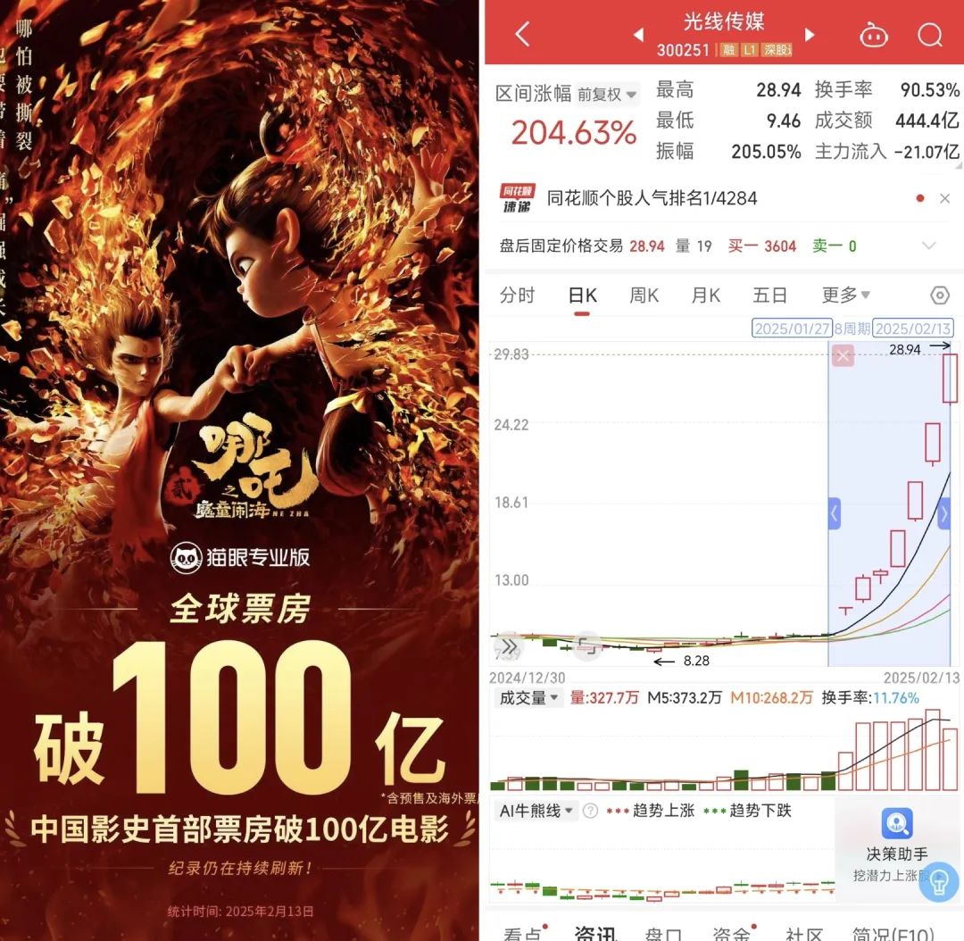 作为出品方,根据此前发布的公告估算,光线目前所能获得的营业收入约为19.6亿-20.9亿元。而若最终票房达到160亿,则营收将超过31.4亿元,预计是其24年全年营收的近2倍。此外,在资本市场,光线的股价从春节前至今已大涨204.6%。