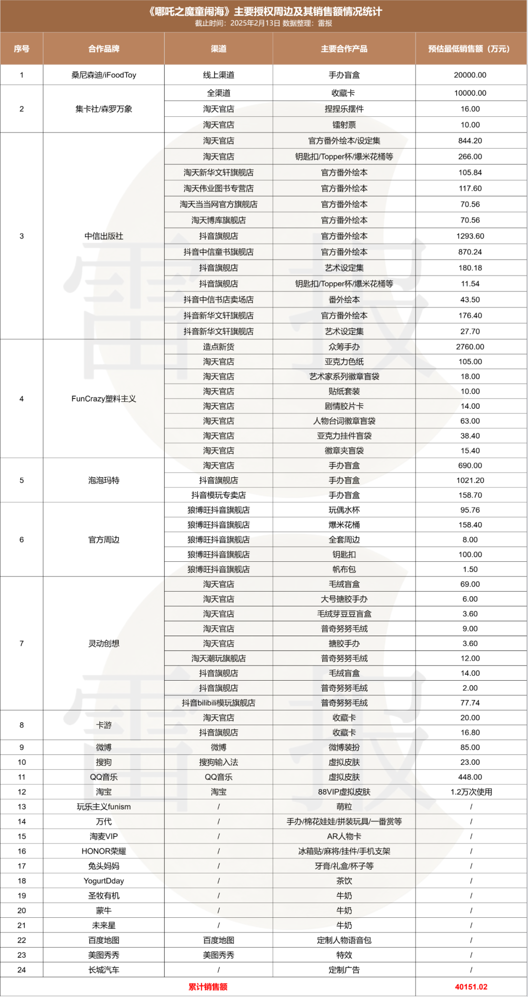其中,IP衍生品市场的火爆尤为值得关注。根据雷报的不完全统计,截至目前,《哪吒2》主要与23家品牌进行了授权合作,联名商品的累计销售额在半个月的时间里突破4亿大关。此外,根据相关网络消息,《哪吒2》的IP授权费已由年前的300万元涨到900-1200万元,若23家品牌的平均授权费为500万元,则不算分成收益,光线便赚了1亿元以上。