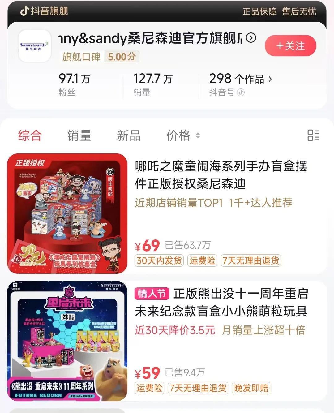 在其抖音方旗舰店,该系列食玩盲盒69元可直接端盒,累计销量达63.7万件,单平台销售额超4395万元,并位居抖音商城潮玩盲盒人气榜的第一位。此外,人气榜第二位的【《熊出没·重启未来》11周年纪念款盲盒】同样由该公司出品,目前已售出9.4万件,预估销售额也超过555万元。