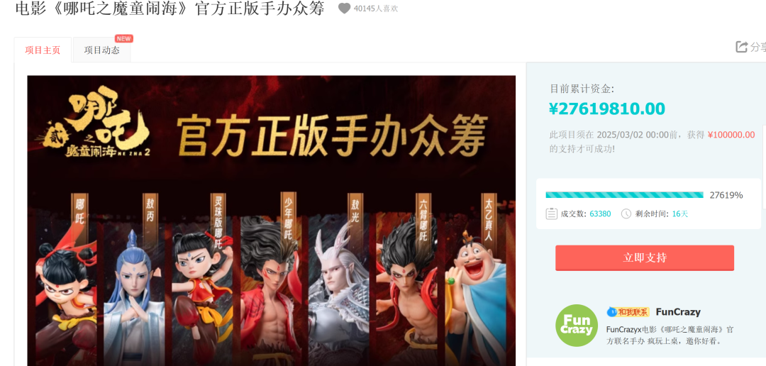 尤其值得一提的是,在阿里鱼旗下众筹平台造点新货上,FunCrazy还发起了《哪吒2》角色手办众筹项目。截至目前,众筹金额已超过2760万元,成交数超6.3万,在仍有16天时间的情况下,众筹金额已达原定目标的276倍。