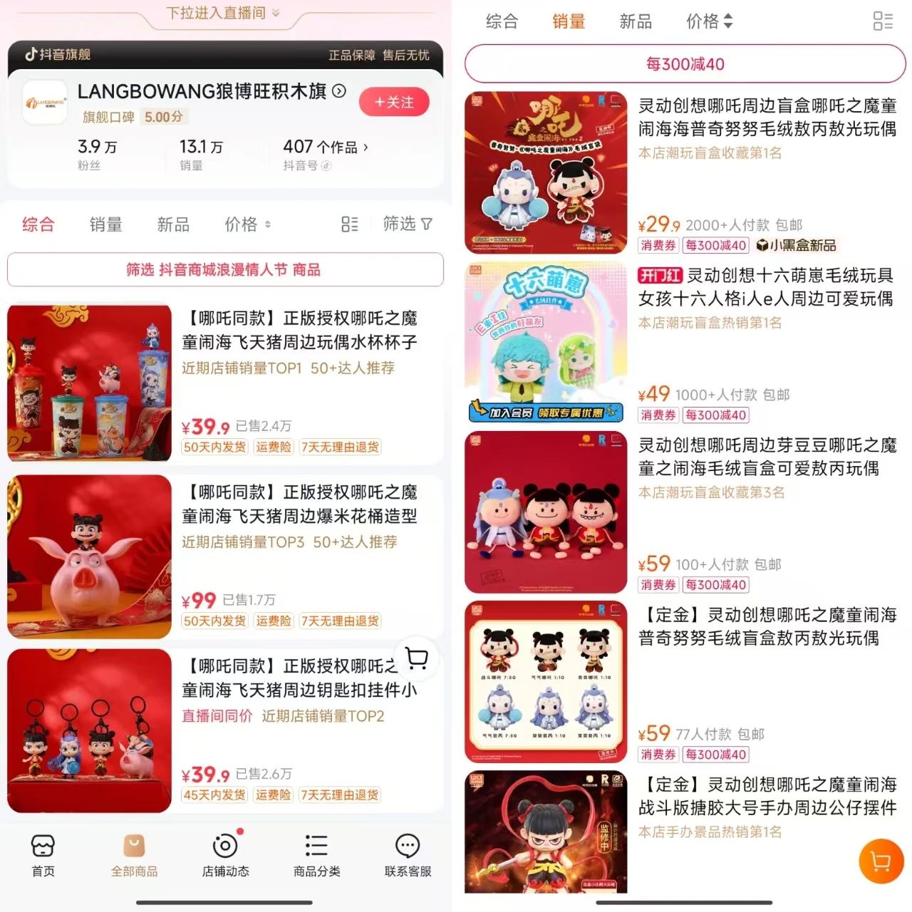 曾推出奥特曼、假面骑士、蜡笔小新等热门IP的衍生玩具的灵动创想,此次也与《哪吒2》联合推出了多款周边,包括搪胶大娃、普奇努努玩偶、芽豆豆玩偶等,在淘天及抖音平台的相关店铺,旗下产品的累计销售额接近200万元。
