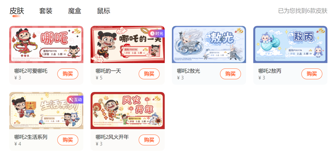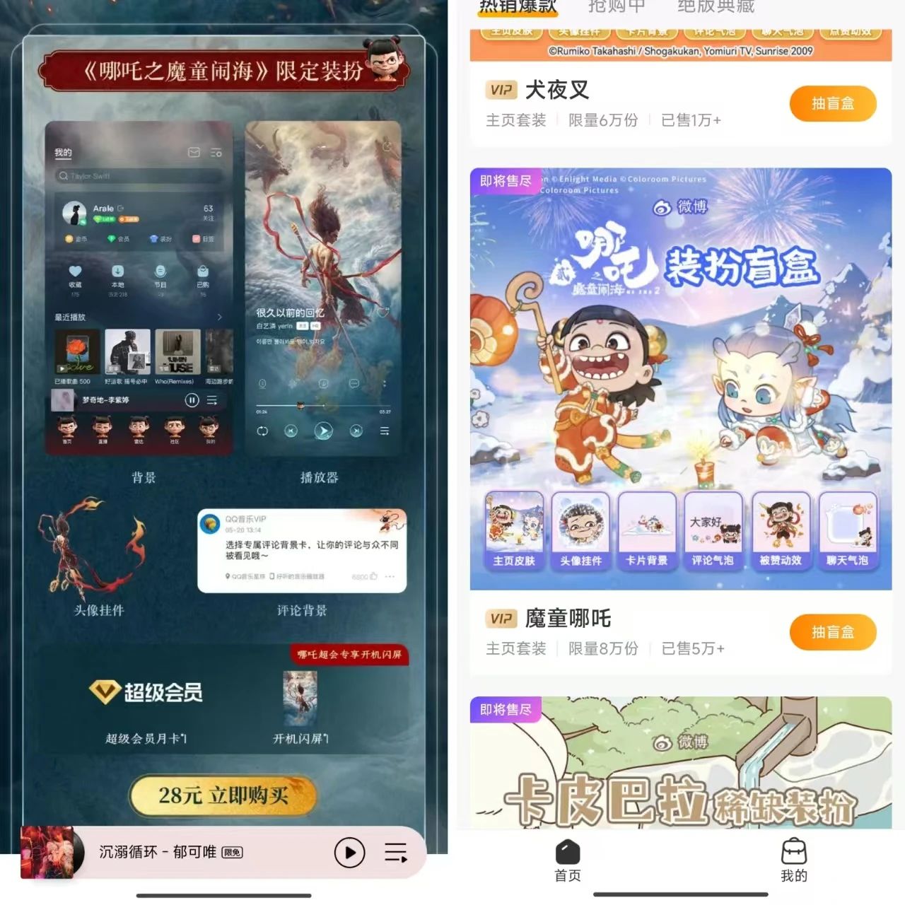《哪吒2》的联名虚拟产品也有不俗的销售表现。例如,在微博,售价17元(增1个月VIP)的【魔童哪吒主页装扮】已售出5万份;在搜狗,售价3-5元不等的输入法皮肤,累计已售出超5.2万套;在QQ音乐,售价28元的皮肤套装使用人数已超16万;淘宝的88VIP虚拟皮肤也已被使用1.2万次。
