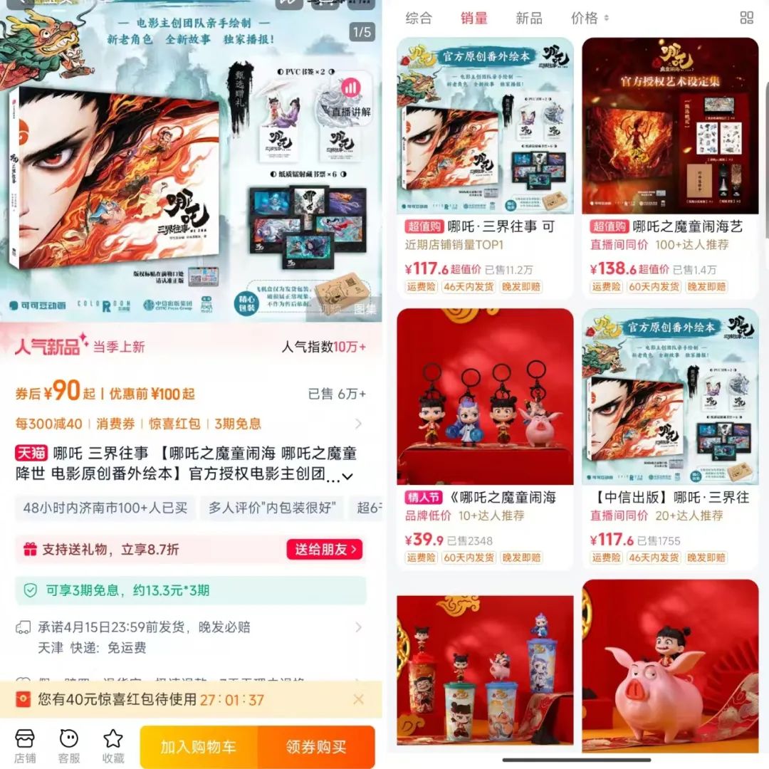 在淘天及抖音平台官方旗舰店,售价117.6元的番外绘本销量分别高达6W+及11W+。此外,旗舰店中销售的哪吒官方周边如钥匙扣、Topper杯、爆米花桶等也有不错销售表现。而综合淘天及抖音平台的其他主要分销店铺,中信出版社主推联名产品的累计销售额更是超过4077万元。