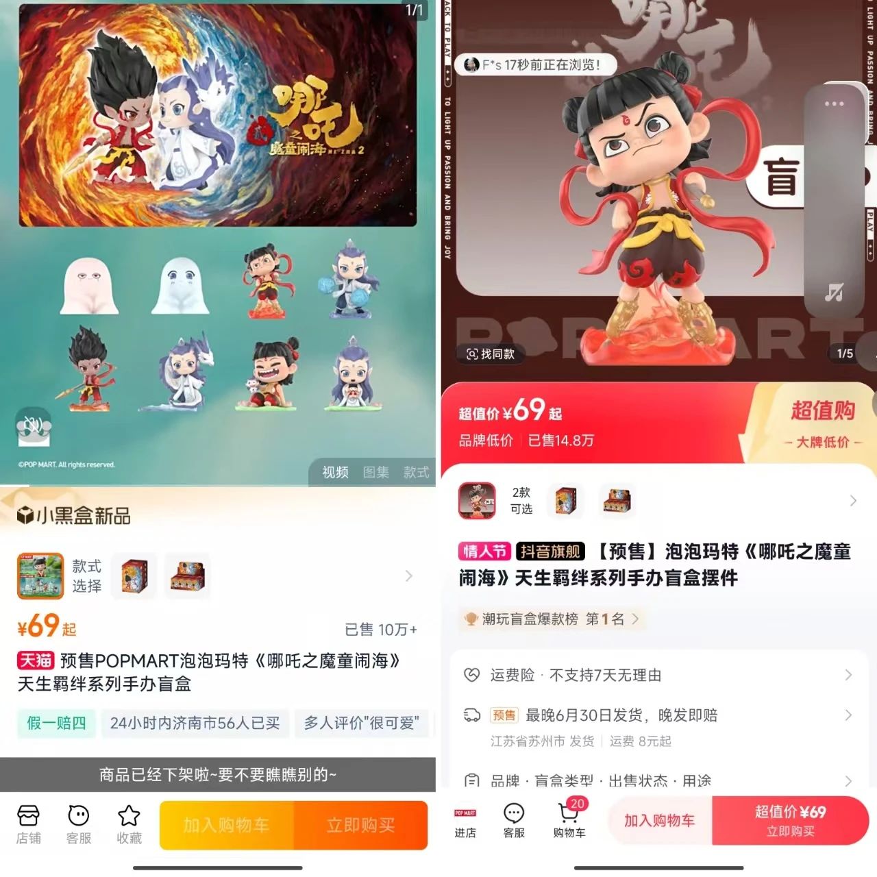 潮玩巨头泡泡玛特则推出【《哪吒之魔童闹海》天生羁绊系列手办】和【《哪吒之魔童闹海》抱抱系列搪胶脸毛绒】两款产品。其中,仅统计淘天及抖音平台主要店铺数据,前者的累计销售额便高达1869.9万元。不过,或许是受到此前国产动画IP盲盒的库存压力,目前系列盲盒销售均为预售模式,预计发货时间已排到了今年6月30日。