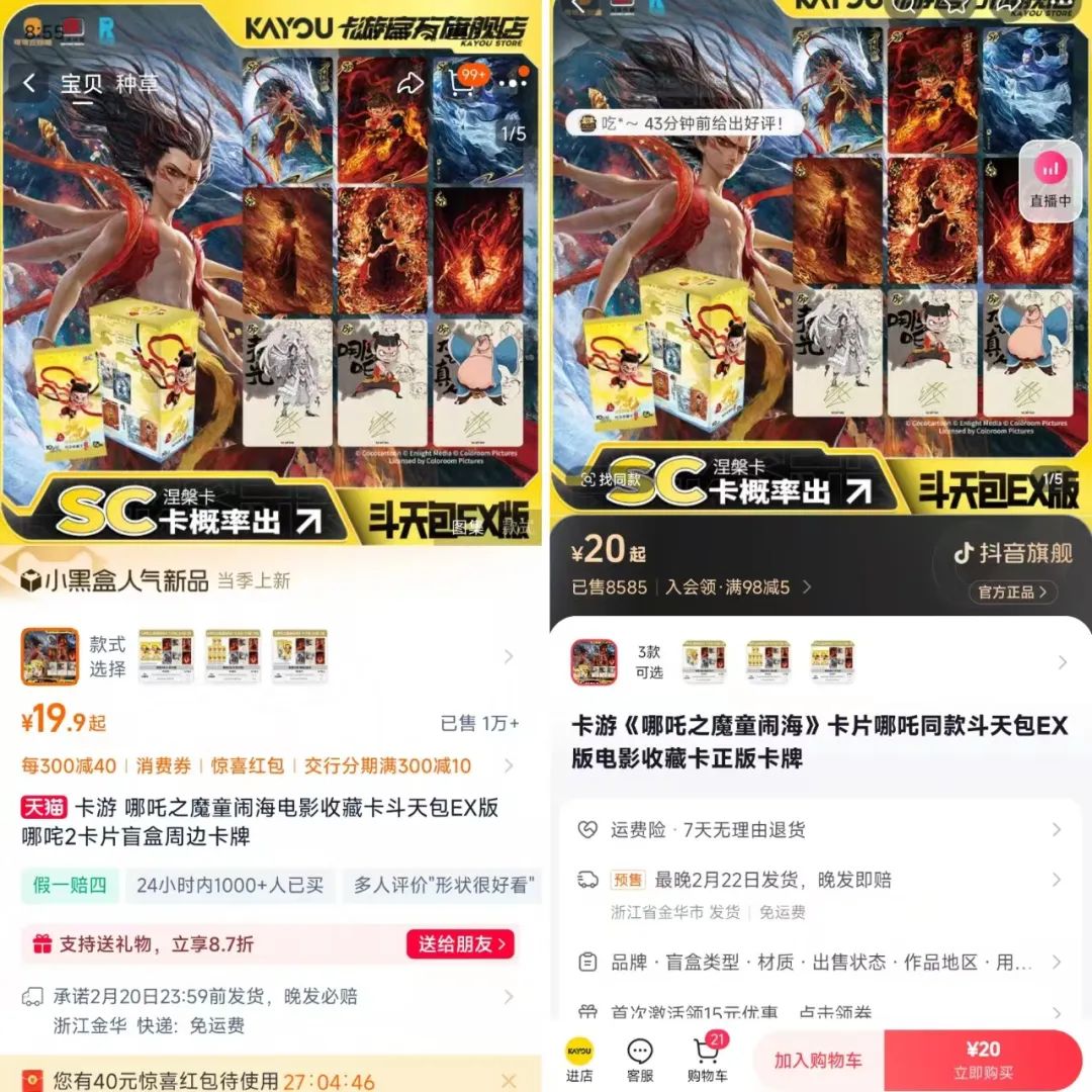 卡牌赛道的领军企业卡游也与《哪吒2》合作推出了联名收藏卡。不过,相较于集卡社,其并未官宣任何销售战报。在淘天及抖音平台官方旗舰店,其联名产品【《哪吒之魔童闹海》电影收藏卡-斗天包】的销量分别为1W+和8400+,预估最低销售额达36.8万元。不过,卡游的渠道优势主要集中于线下,雷报此前统计中,其线下门店已超过400家。因此,此次联名产品的销售额应主要来本文无法统计的线下渠道。
