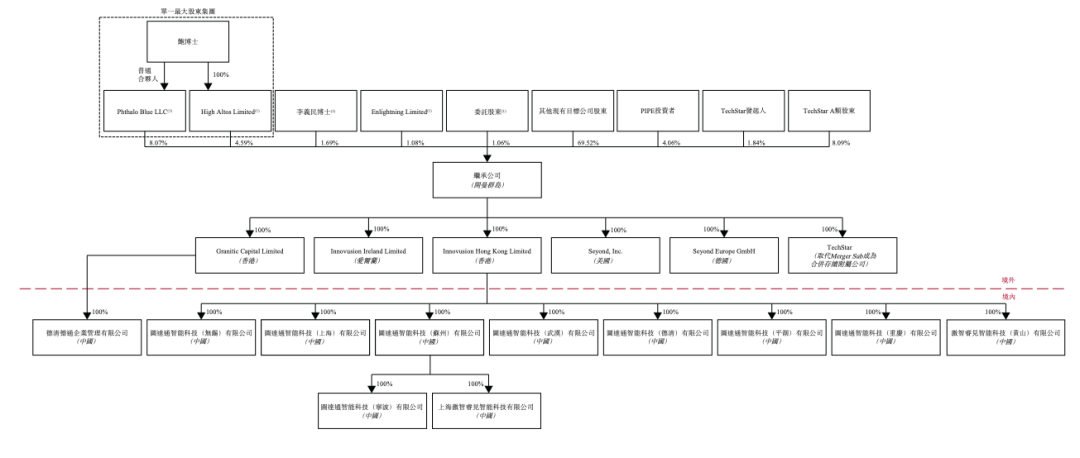 假设无TechStar A类股东赎回股份,IPO后,图达通创始人鲍君威将通过旗下High Altos Limited控制公司4.59%投票权,通过Phthalo Blue LLC控制8.07%投票权,通过Enlightning Limited(雇员持股计划)持股1.08%,通过委托股东持股1.06%,合计控制公司约14.8%投票权;联合创始人、CTO李义民持股1.69%,TechStar发起人持股1.84%,TechStar A类股东持股8.09%;PIPE投资者中,黄山建投资本持股2.85%,富策持股1.15%,珠海横琴华盖持股0.06%。